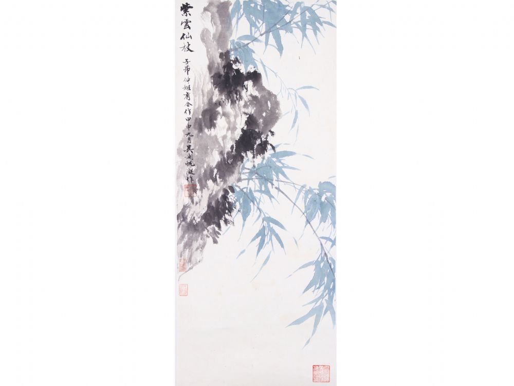 作品简介:吴湖帆是二十世纪中国画坛最为重要的一位大师,是无可争议的海上画派领袖,他在中国绘画史上的意义其实已远超出他作为一名画家的意义。作为一位集绘画、鉴赏、收藏于一身的显赫人物,他的成就是多方面的,可以说代表了中国绘画史上的一种现象。吴湖帆天纵奇才,对《富春山居图》全本临摹,三百年来第一次,也是唯一一次做到了《富春山居图》的全图合璧。在2011年北京翰海秋拍,《富春山居图》拍出9890万元的高价。吴湖帆曾说画古木竹石,较画山水为难,以其笔法疏简,而气韵须充沛,非深通画学者,不晓也。此幅乃吴湖帆仿赵孟頫、管道升笔意,赵孟頫是中国文人画史不可避开的关键人物,博学多艺、冠绝古今。管道升工诗善画,晴竹新篁,为其首创。二人伉俪情深、琴瑟和谐,皆擅画墨竹,几支竹子,胜于千岩万壑。