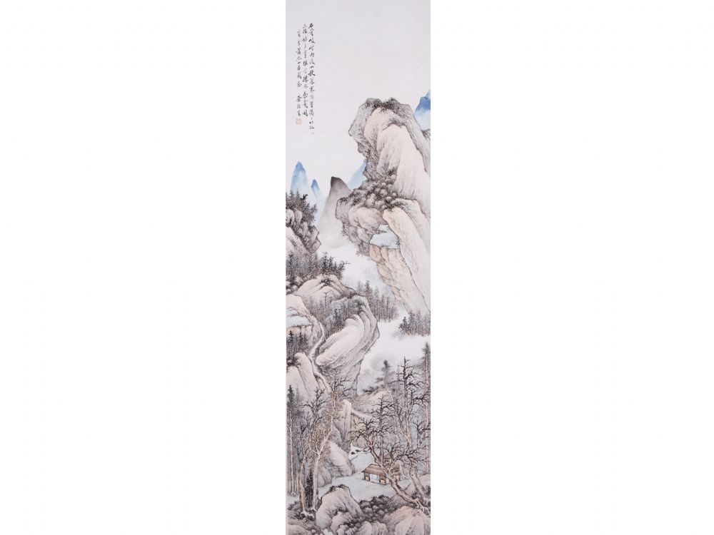 作品简介:黄君璧的山水画,笔精墨妙,尤其留意和擅长刻画流云、飞瀑、溪水、湖泊等“云”、“水”的形象,形成了沉稳、厚重、氤氲、静谧的总体风格。黄君璧在这幅作品中利用传统的“高远”构图,画面上方运用淡墨勾画远山,云雾缭绕;画面底部,溪流潺潺,流水淙淙,寂静空灵的意境令人神清气爽。作品也尤为注重对细节的刻画:近景中的树石,近实远虚,和远山形成鲜明对比。整幅作品,用笔劲健、纯熟;墨色层次分明、对比鲜明而协调;色彩沉稳、清雅;山石的刻画浑厚华滋,云水的表现飘渺、流转。其间淡墨写出的隐约枝干又疏离可见。作品中的近景刻画,墨色浓重;远景中多使用淡墨,其墨色富于微妙的变化又层次分明,湿笔的运用也得心应手,故作品颇具“墨分五色”带来的典雅,营造了诗意葱茏、和轻柔恬静的意境。黄君璧作为中国山水画大家,其作品被海内外人士收藏。在2010年北京匡时秋拍上,黄君璧作《万壑松风图》以795.2万元的价格成交,平均每平尺约51.3万元。