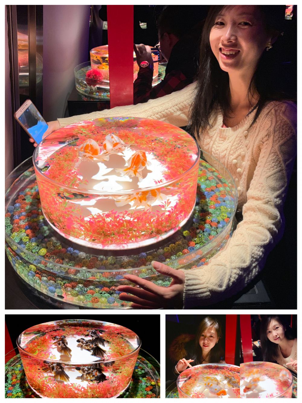 可通过鱼缸表面各种凹凸镜面观赏金鱼的作品。透过凹凸镜可以看到金鱼在鱼缸中遨游嬉戏,忽大忽小,变化莫测,体验不可思议的水中世界。