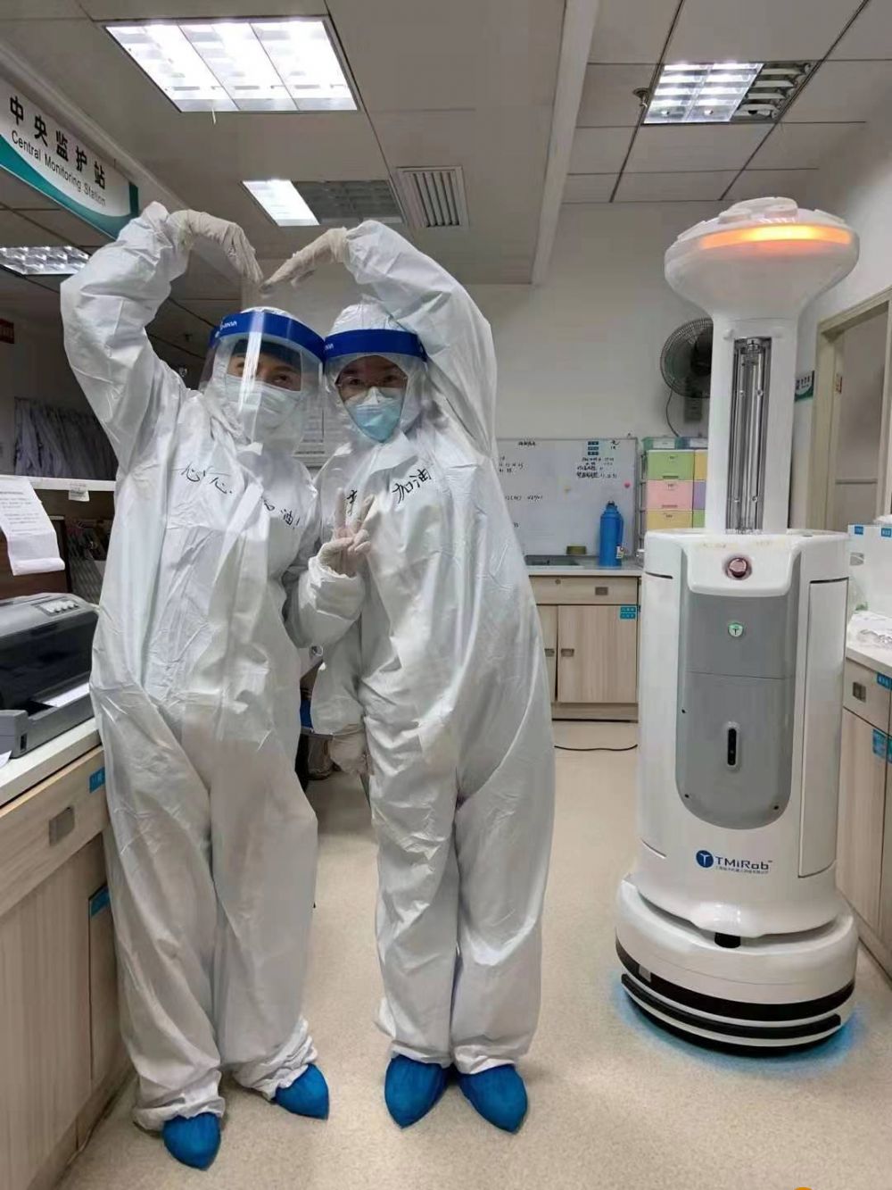 图1:消毒机器人在武汉协和医院血液科ICU与医护人员并肩作战