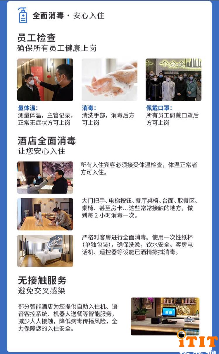 本次“返工安心住”活动,汇集了全国逾2000家品牌酒店的“安心隔离房”,且各酒店均已向属地政府相关部门完成报备,并根据相关防疫要求,备足防疫及消毒用品,严格执行酒店公共区域及客房的消毒防疫制度,并对包括酒店员工在内的所有出入人员实施体温检测、出入登记等安心防疫措施。部分酒店还通过多样化智能设备为客人提供无接触服务,以有效避免交叉感染。
