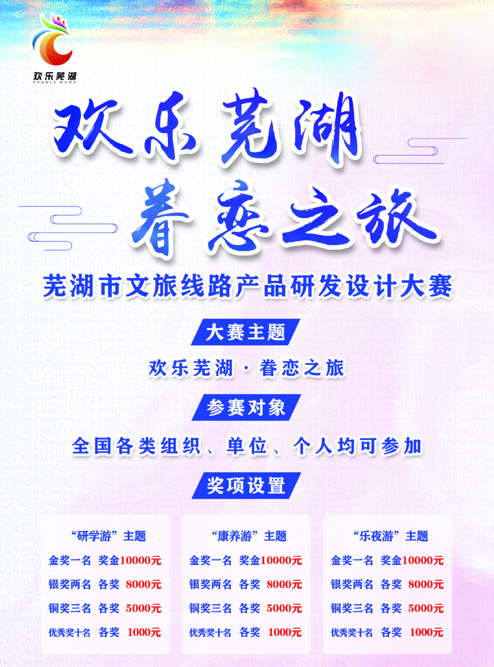 此次大赛要求紧扣“欢乐芜湖”主题,围绕“研学游、康养游和乐夜游”三大主题,可涵盖和串联长三角、G60和皖南国际文化旅游示范区城市文旅资源,创新研发设计文旅线路产品。全国各类组织、单位、个人均可报名参加,大赛获奖者最高可得万元奖金。