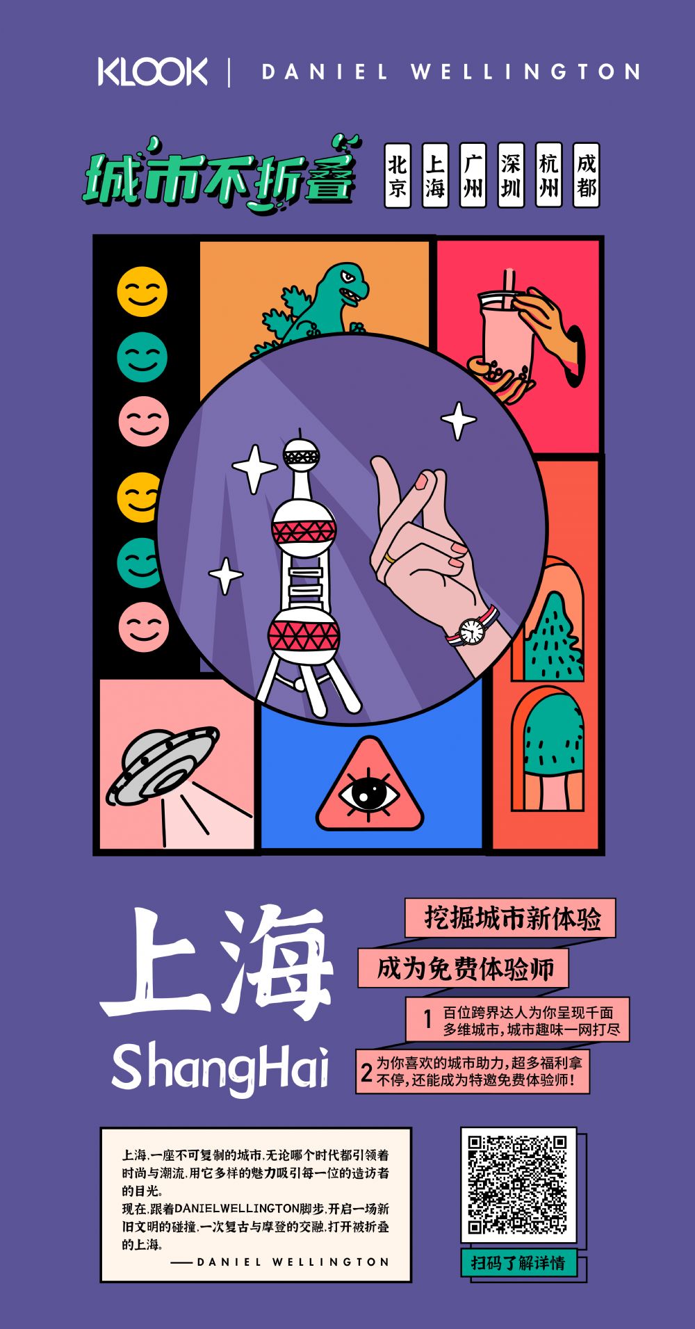 对于DANIEL WELLINGTON而言,上海是一座不可复制的城市,无论哪个时代都引领着时尚与潮流,吸引着每一位造访者的目光。通过与KLOOK客路旅行的合作,进一步探索这座充满魅力的城市:让时尚与经典碰撞,让复古与摩登的交融。