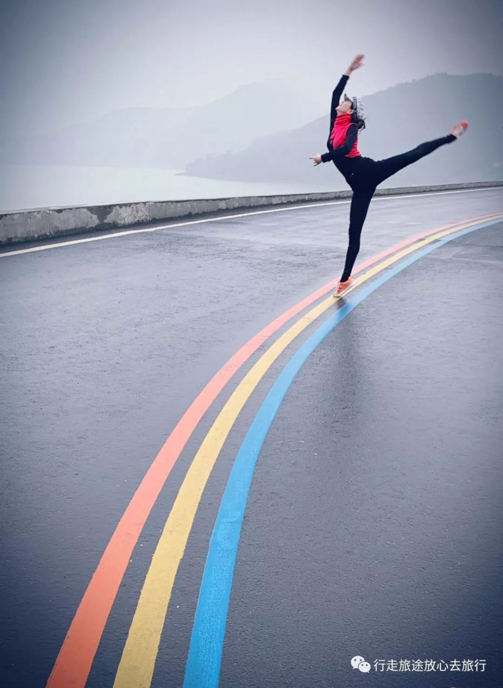 还是一月中旬的冬季,在蒙蒙细雨中,“芭蕾公主”在彩虹路上翩翩起舞!她的优雅舞步,沿着彩色标志线连续跳跃了10多米,一气呵成。优美造型的舞蹈与静谧的连绵起伏山峦、湖面、孤舟、田野、公路彩虹线组合的天然舞台浑然一体,动与静柔和地融合、构成了绝佳意境……