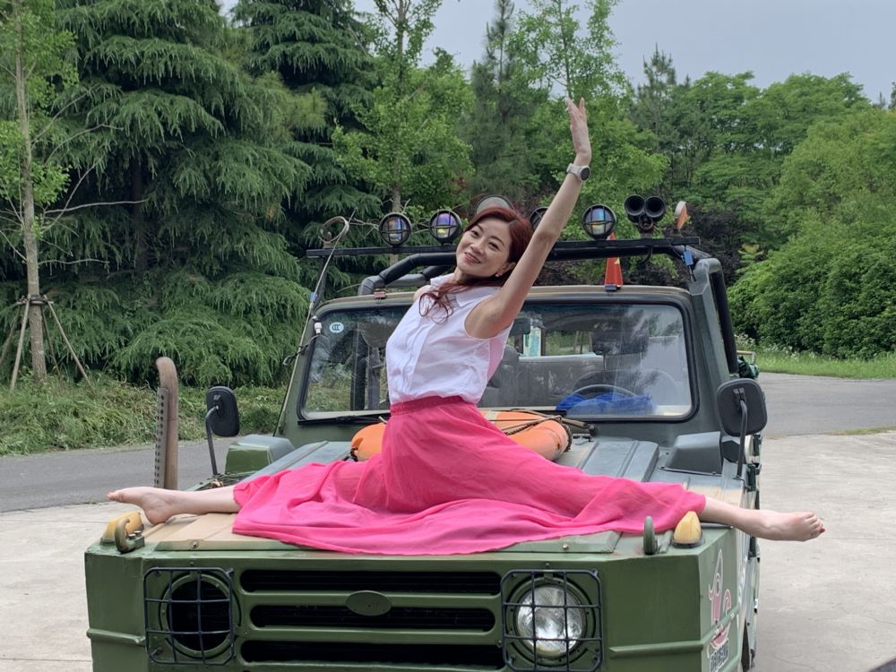 在西沙明珠湖景区“泛舟”体验着速度与激情的 “芭蕾公主”,情不自禁地在明珠湖畔、和水陆两栖车上优雅展风姿……