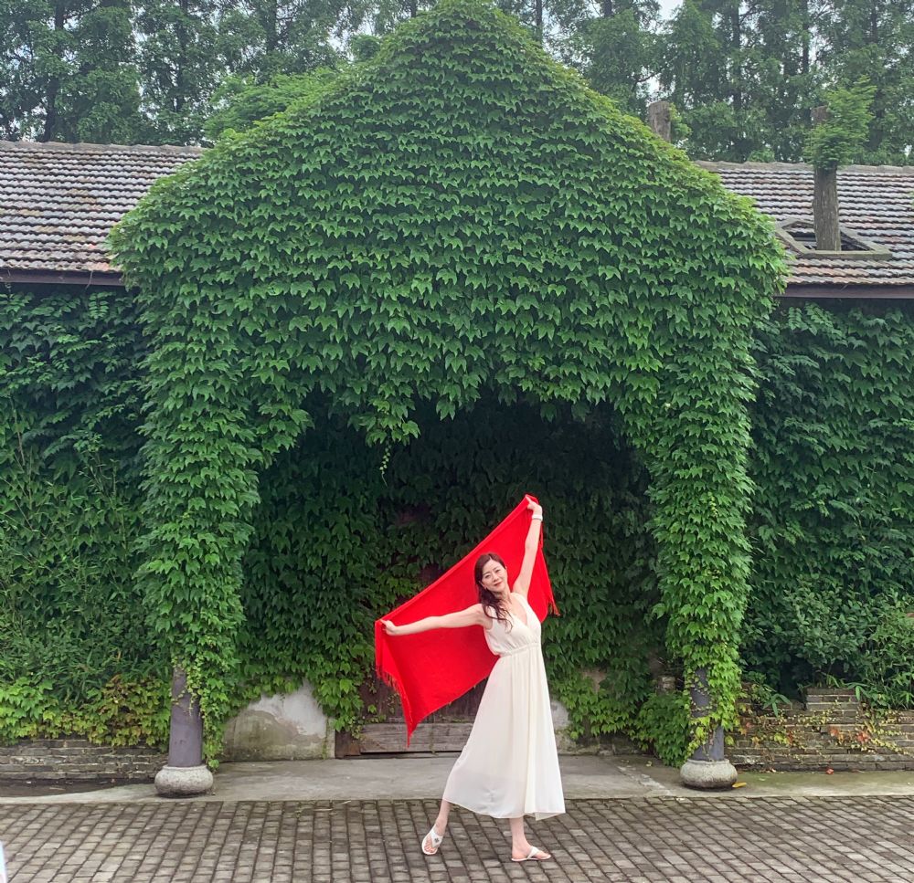 图为上海媒体文旅采风团日前特邀国家一级演员、芭蕾舞蹈家张薇莹,来到江南三民文化村在非遗传承人的指导下,体验崇明土布机纺织技艺操作。“芭蕾公主”张薇莹还在文化村广场设计独特的绿色环保“树门”前一展风采、拍照留念。