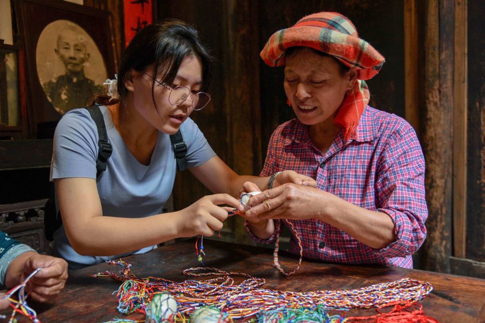 图2 篁岭古村 “晒秋大妈”和游客一起编鸭蛋络