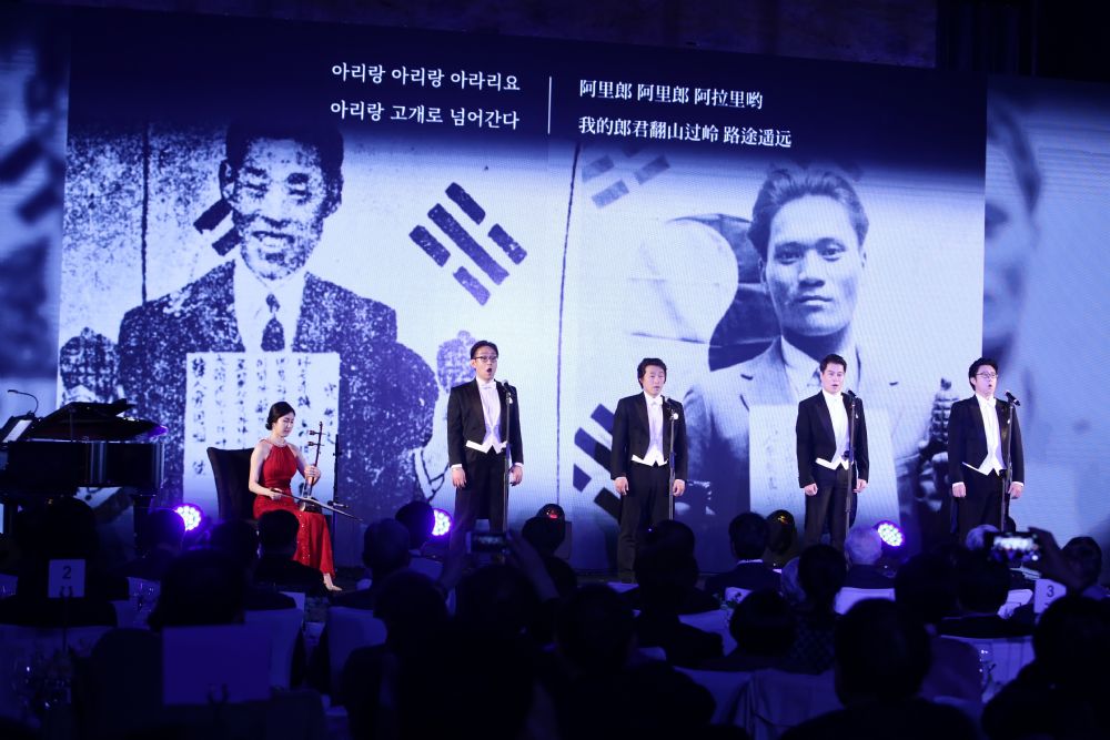 纪念仪式上,韩国国立国乐管弦乐团室内乐五重奏乐团现场演奏了韩国代表性民谣《桔梗谣》和中国陕西地区特色民歌《兰花花》等经典曲目,为在场观众呈现了一个感人至深的舞台。在独立军音乐会环节,耳熟能详的《阿里郎》和缅怀韩国革命志士的《英雄》、《面庞》等歌曲也一一登场。低沉而雄厚有力的男声四重唱,在充满哀切的钢琴与奚琴伴奏下,不知不觉间拨动了在场观众的心弦。