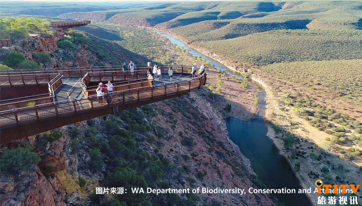 据了解,西澳著名的卡尔巴里国家公园于今年6月中旬开放了全新的卡尔巴里空中步道 (Kalbarri Skywalk),在穆尔其森河 (Murchison River) 峡谷边缘的最高点,延伸出长达25米和17米的两条观景步道,距离河面的高度超过100米,可以让游客从全新的角度,欣赏公园里壮丽的峡谷、锈红色的岩石、蜿蜒的河水和广阔的原野风光。