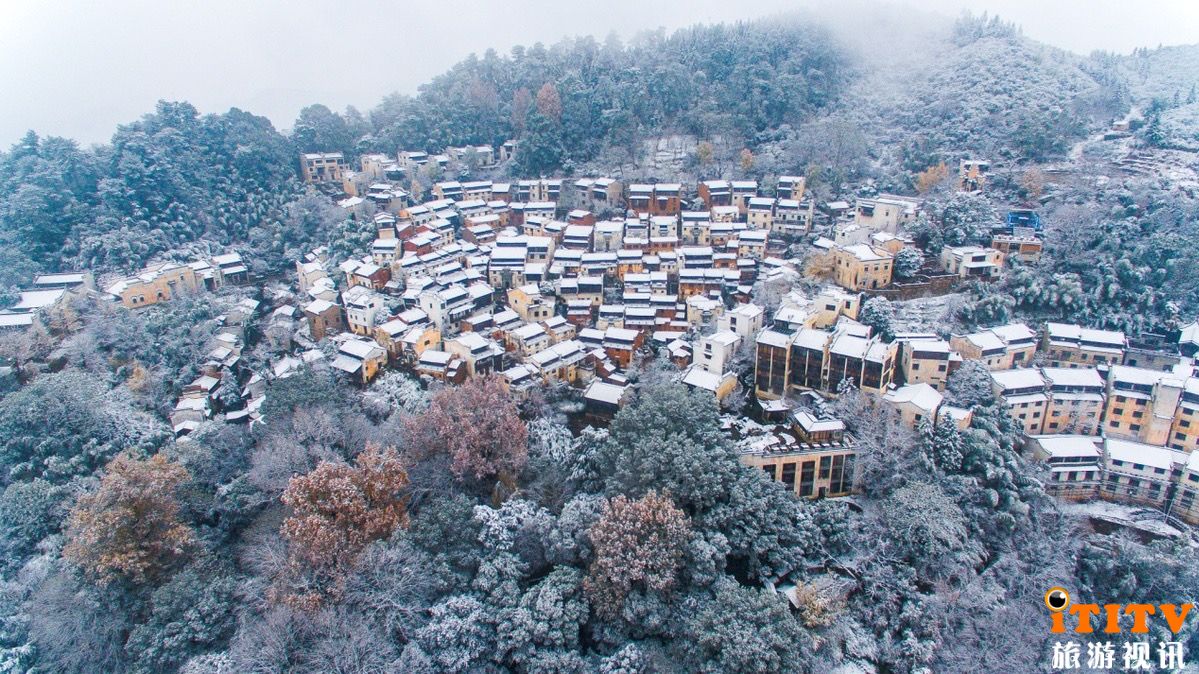 12月14日,受寒潮天气影响,被誉为“晒秋人家”的江西上饶婺源篁岭古村迎来了今冬的第一场雪。