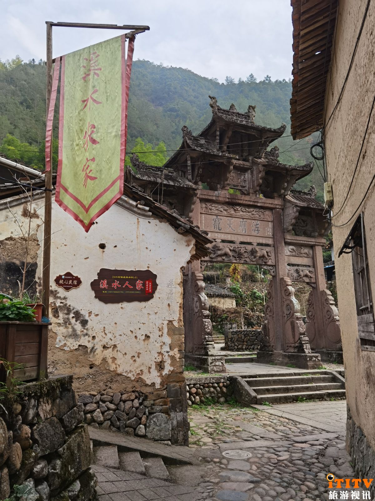 这座牌坊坐东南朝西北,明隆庆3年(1569年)建。牌坊上方镌刻着“洊膺天宠”四字,意指村里叶以藩于明嘉靖41年(1562年)考中第二甲十九名进士,官至工部员外郎,后因病去世。隆庆帝即位后,叶以藩之父叶弘渊依然享受子贵所受诰封。隆庆3年,遂昌知县池裕德建牌坊,以示叶氏再受天子宠任之意。