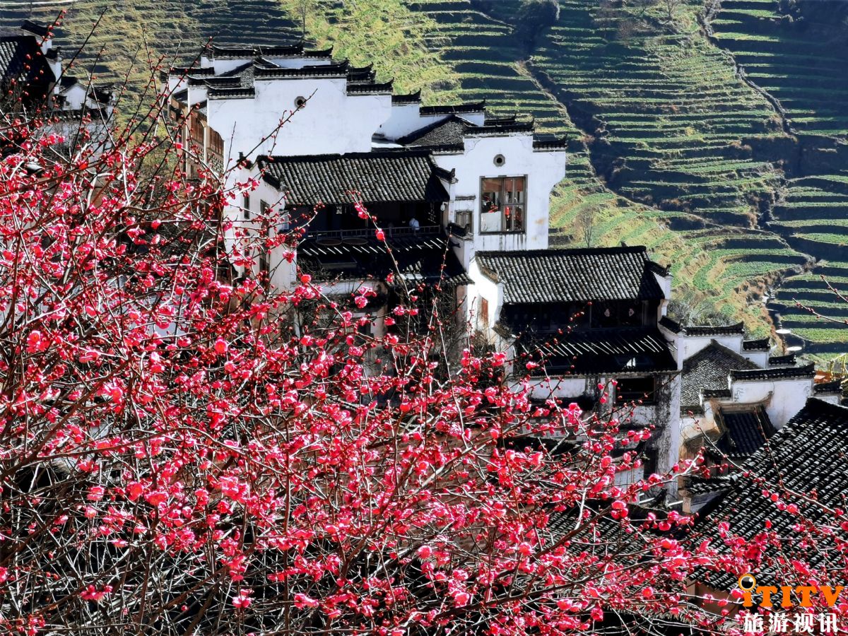 立春标志着万物闭藏的冬季已过去,开始进入风和日暖、万物生长的春季。早春二月,篁岭凌寒盛开的腊梅还未开尽,闻春而动的红梅又已含苞吐蕊、绽放枝头。团团串串的红梅开满了道路两旁,未近其树,已“见”暗香浮动“暖心”来。目前婺源天气渐暖,篁岭的万亩梯田油菜花海,预计将在三月初正式进入赏花期。