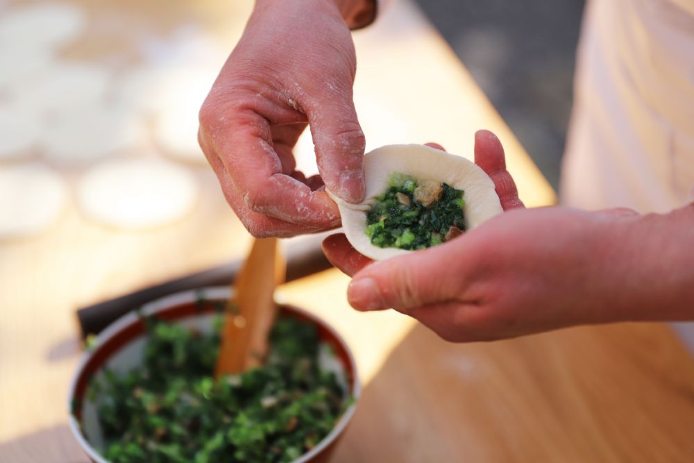 周末一个春日的上午,在温暖的阳光下和满院的春色中,面点大师汪丽萍为我们制作了三道面点,将春天包进了面点里,来到了我们的舌尖。 包子是餐桌上最常见的主食之一,尤其是北方人,早餐吃两个小包子,不仅味道好、吃着方便而且还能满足人体对营养的需求。然而,包子好吃但并不好做。想要做一笼色香味俱全的包子,仅仅是馅儿,都要有很多的讲究,尤其是素菜馅儿的包子。 如何能让蒸熟后的素菜包子馅翠绿鲜嫩呢?蔬菜在做馅儿前,需要在加少许食盐和食用油的开水中焯水,然后迅速放入冷水中浸凉,控干水后切碎,加调味料拌馅即可。不信你可以试一下,用这种方法蒸出来的包子是不是让人更有食欲呢? 你还记得葱油饼长什么样吗?圆圆的、金黄色当中带一点焦,撒满了翠绿的葱花。葱油饼用料相当考究。普通面粉的营养成分全面,可以保证饼的韧劲,增加香脆度。葱要选上海本地的小香葱,特别是春天的小香葱鲜嫩翠绿。而葱油饼的“油”,一定要刷上猪板油,饼也不能压得太薄,咬上去丰富的层次感相当重要! 葱油饼一定要趁热吃,刚刚出炉的葱油饼吸足了葱油,香气扑鼻!外脆里韧!一口咬下去,面饼的层次感,带着猪油的葱花香,一点点会将嘴巴塞满,这股幸福感随即会传递到全身。 虾饺 晶莹剔透,白里透红,既好看又好吃的虾饺是广州茶楼最具代表性的点心之一。 虾饺皮的来历可不简单!首先在刚烧开的水中加入澄粉搅拌均匀,冷却到常温时混上少许熟猪油糅合成面,用这种方法做出来的虾饺皮才能足够筋道。虾饺皮是用刀片压出来的,将皮拍成一边厚一边薄,薄的那一边用来做纹,厚的那一边用来做底。 虾饺馅的制作,在新鲜的虾肉里,放少许食盐,适量麻油和少许胡椒粉,与虾仁一同搅拌起胶后,加入糖和生粉调味,再放入春笋粒,肥肉粒和少许猪油搅拌即可。包虾饺用的是一边拖一边推的手法,将馅料包进虾饺里,面皮的折痕要比较大,成品才会美观。包好的虾饺放进竹制的蒸笼,用旺火蒸五分半到六分钟。 爽口的外皮,鲜味十足的弹牙虾仁在入口的一刻破皮而出,就仿佛春姑娘在舌尖上舞蹈。 汪丽萍是中式面点一级技师,曾任职于银河宾馆和兰生大酒店等多家知名酒店,师承点心大师邓修青,精通海派点心的制作。曾于2011年荣获全国中餐技能创新大赛面点项目金奖。2015年美国加州核桃厨艺大师创意料理金奖,及2016年中国烹饪协会颁发的中国烹饪大师证书。她积极培养年轻面点师,发扬和传承传统中式面点文化。