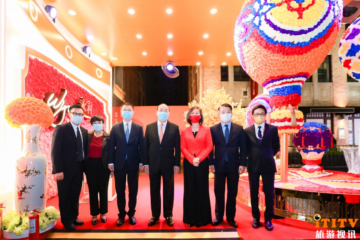 图1: 澳门特别行政区行政长官贺一诚、中央政府驻澳门联络办公室副主任姚坚、经济财政司司长李伟农、旅游局局长文绮华、贸易投资促进局主席刘伟明、旅游局副局长程卫东及澳门永利有限公司副主席兼执行董事陈志玲亲临参观永利在“上海澳门周”的展位。(永利传讯提供)