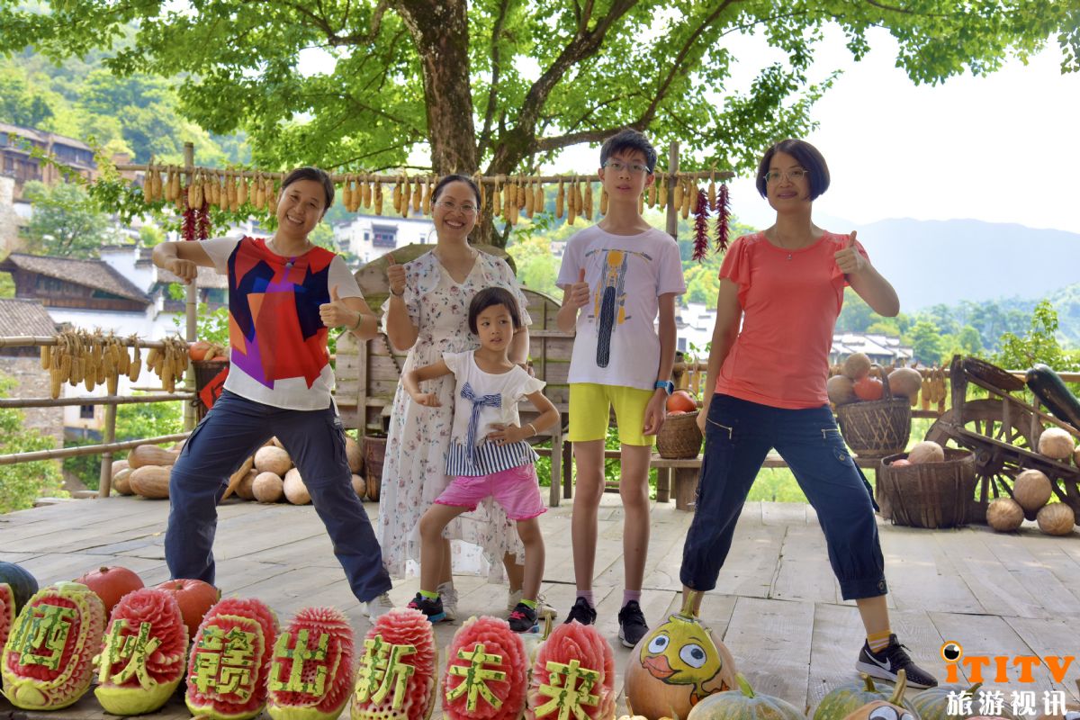 穿过民俗广场,可以看到晒秋大妈们用南瓜、冬瓜、玉米、稻谷等农作物创意打造的晒秋场景供游人拍照打卡;能工巧匠的晒秋大叔,用不同瓜果雕刻出栩栩如生的各种造型和幸福表情。还有晒秋体验区,晒秋大妈准备好各式农作物和晒盘,让游客晒出自己想晒的图案或者祝福语,淋漓尽致的展现出篁岭晒秋人的果蔬创意晒。