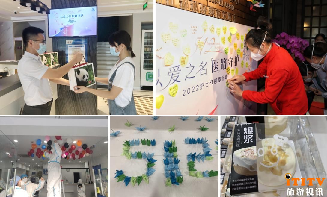 护士节感恩行动期间,锦江酒店(中国区)援沪医疗队服务保障领导小组通过集团旗下静安面包房统一向所有援沪接待门店配送庆祝蛋糕,在严格遵守当地防疫要求的前提下,尽量为医护人员带来一些节日的仪式感。在共同防疫的这段时间,各酒店和援沪医疗队建立了并肩作战的深厚友情,特精心准备了这场“花式告白”感恩行动,来感谢白衣天使们的爱与奉献:户外滚动屏上醒目耀眼的祝福语、可爱的手折千纸鹤、充满温情的手写贺卡、制作精美的许愿墙、精心排练的优美舞蹈……一系列“以爱之名”的暖心互动,为这个特殊的护士节带来美好记忆。