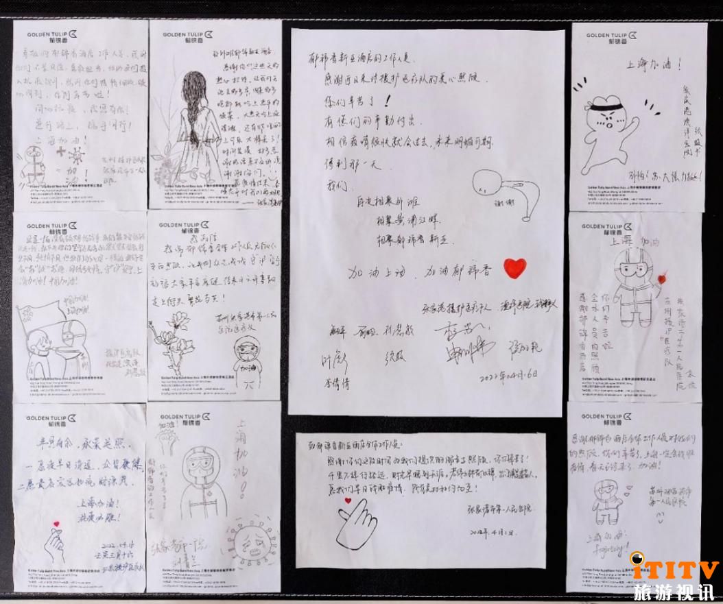 护士节感恩行动期间,锦江酒店(中国区)援沪医疗队服务保障领导小组通过集团旗下静安面包房统一向所有援沪接待门店配送庆祝蛋糕,在严格遵守当地防疫要求的前提下,尽量为医护人员带来一些节日的仪式感。在共同防疫的这段时间,各酒店和援沪医疗队建立了并肩作战的深厚友情,特精心准备了这场“花式告白”感恩行动,来感谢白衣天使们的爱与奉献:户外滚动屏上醒目耀眼的祝福语、可爱的手折千纸鹤、充满温情的手写贺卡、制作精美的许愿墙、精心排练的优美舞蹈……一系列“以爱之名”的暖心互动,为这个特殊的护士节带来美好记忆。