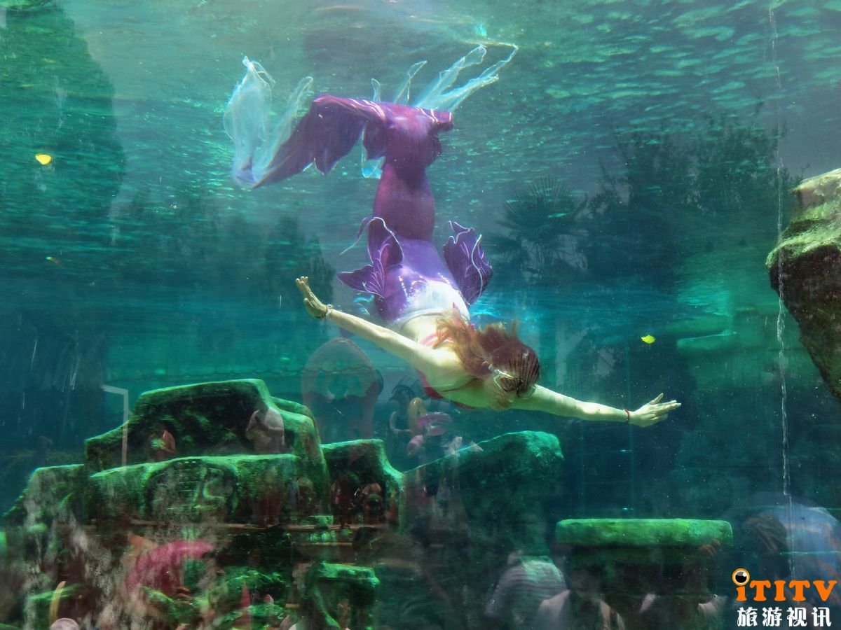 在玛雅水公园潜水区,美人鱼表演者通过腰腹核心力量摇摆发力、带动身躯在水中缓缓游动,用比划爱心、飞吻等方式,隔着巨型玻璃与展演缸外观赏的游客互动,并做出垂直悬浮、平行侧游、仰游等技巧动作,充分展示了形态美和健康美。美人鱼表演者在阳光的透射下,如同精灵般在水中曼妙起舞,柔美而灵巧的姿态吸引了许多游客的目光。