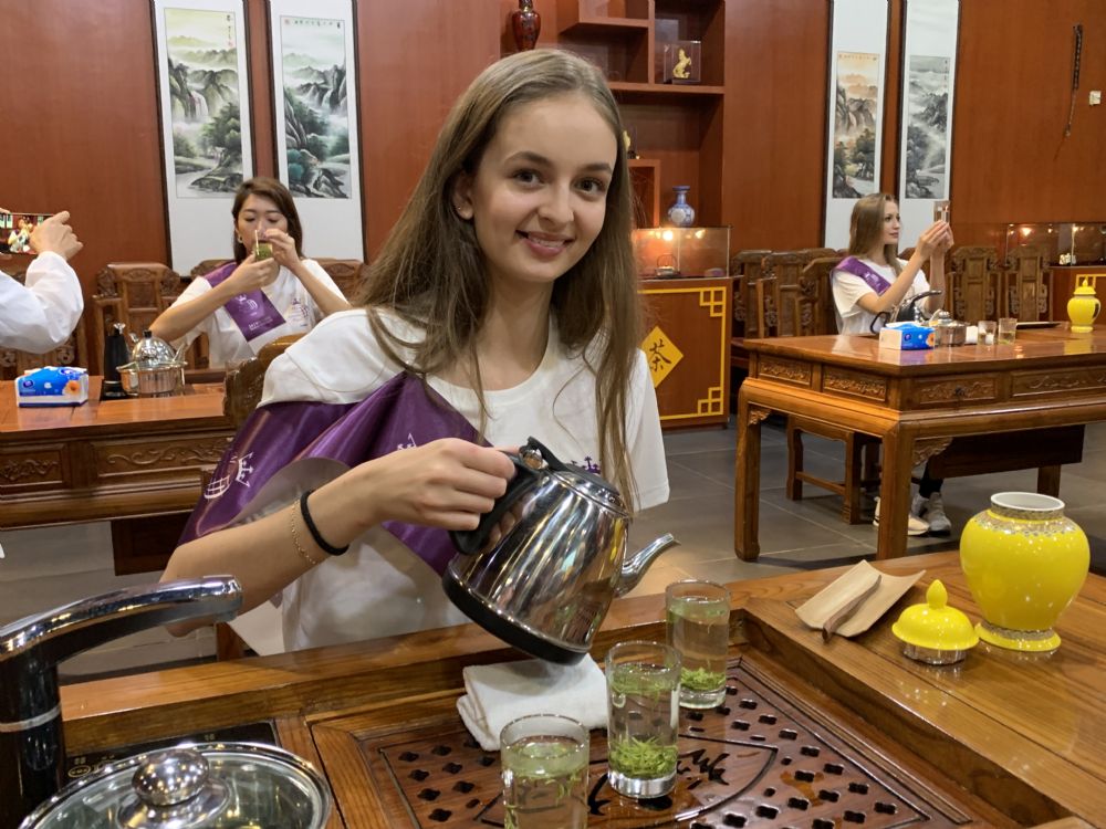仙山贡水,浪漫宣恩。6月25日,国际旅游小姐走进湖北恩施州宣恩县首日——在蒙蒙细雨中,参赛佳丽们上午登车巡游前往伍家台贡茶景区,挂上茶篓兴致勃勃学习采茶,随后又来到茶博物馆参观,并坐在茶桌前品贡茶、学泡绿茶。乘坐热气球鸟瞰伍家台景区。下午,身穿民族服装的“土司夫妇”携国际佳丽们,在具有土家建筑风格的风雨桥头为市民展示了青春的风釆, 随即佳丽们又与当地歌唱演员、观众一起齐声高唱歌曲“我和我的祖国“,开展快闪活动。夜幕中,各国佳丽又登上露天舞台,身着风格各异的民族服饰,与当地演员一起,演绎了绚丽多彩的土家族苗族风情歌舞和时尚秀。