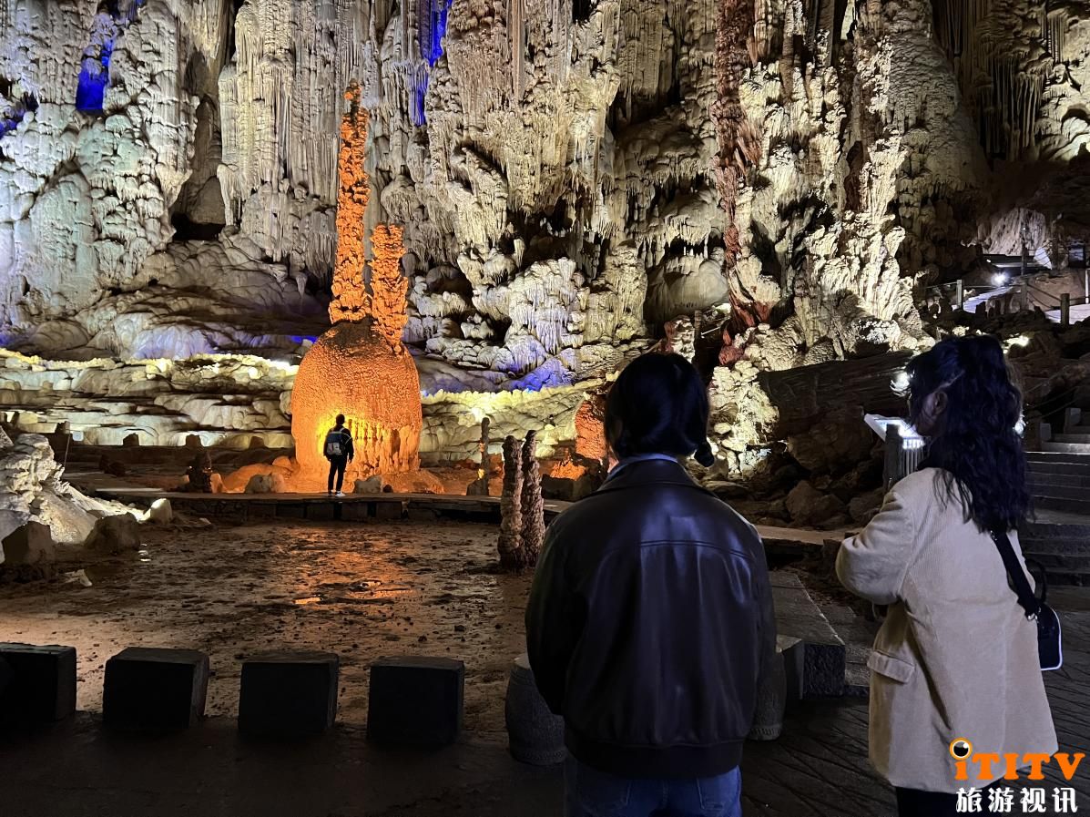 踩着石阶而上进入了洞穴,采风团成员中有的来过有的第一次来,大家都兴致盎然游走在这座地下天宫:惟妙惟肖的“倒挂琵琶”、虚无缥缈的"铁山云雾"、母慈子孝的“婆媳情深”……如置身于崇山峻岭、险峰巉岩之中,静态里透出浩荡的洪荒之力,大家除了惊叹洞穴的神奇百变,更被洞内四季恒温的16℃暖暖包围,不舍离开这个"岩溶博物馆"。