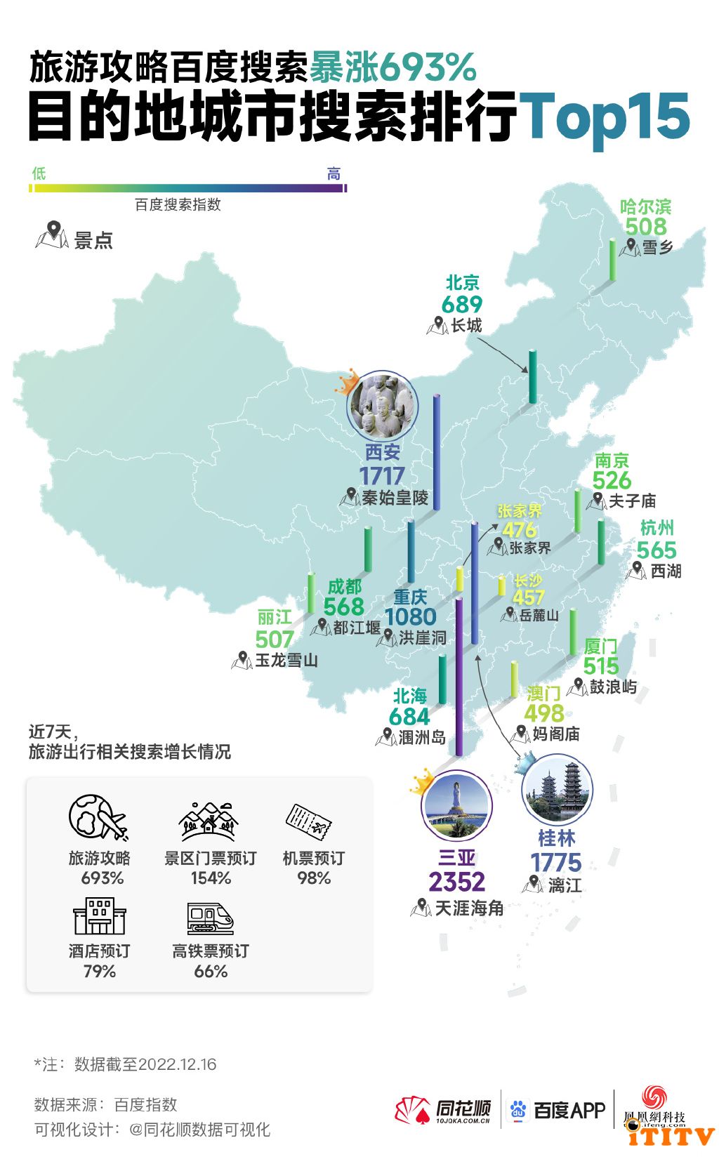 2022年12月7日 “新十条”发布后,各旅游平台上的出行搜索量迅速增长。携程平台上的机票瞬时搜索量猛增160%,其中,春节前夕的机票搜索量暴涨至三年以来最高点;去哪儿平台的机票瞬时搜索量增长7倍,其中春运期间的机票搜索量达疫情前水平,火车票搜索量增长5倍;同程旅行平台大交通综合搜索量快速上涨,机票瞬时搜索量较前日同一时段上涨438%,火车票瞬时搜索量上涨276%。“新十条”再次燃起人们对旅游的热情,各平台关于旅游产品、旅游攻略、酒旅业务的搜索量和预订量明显增长。