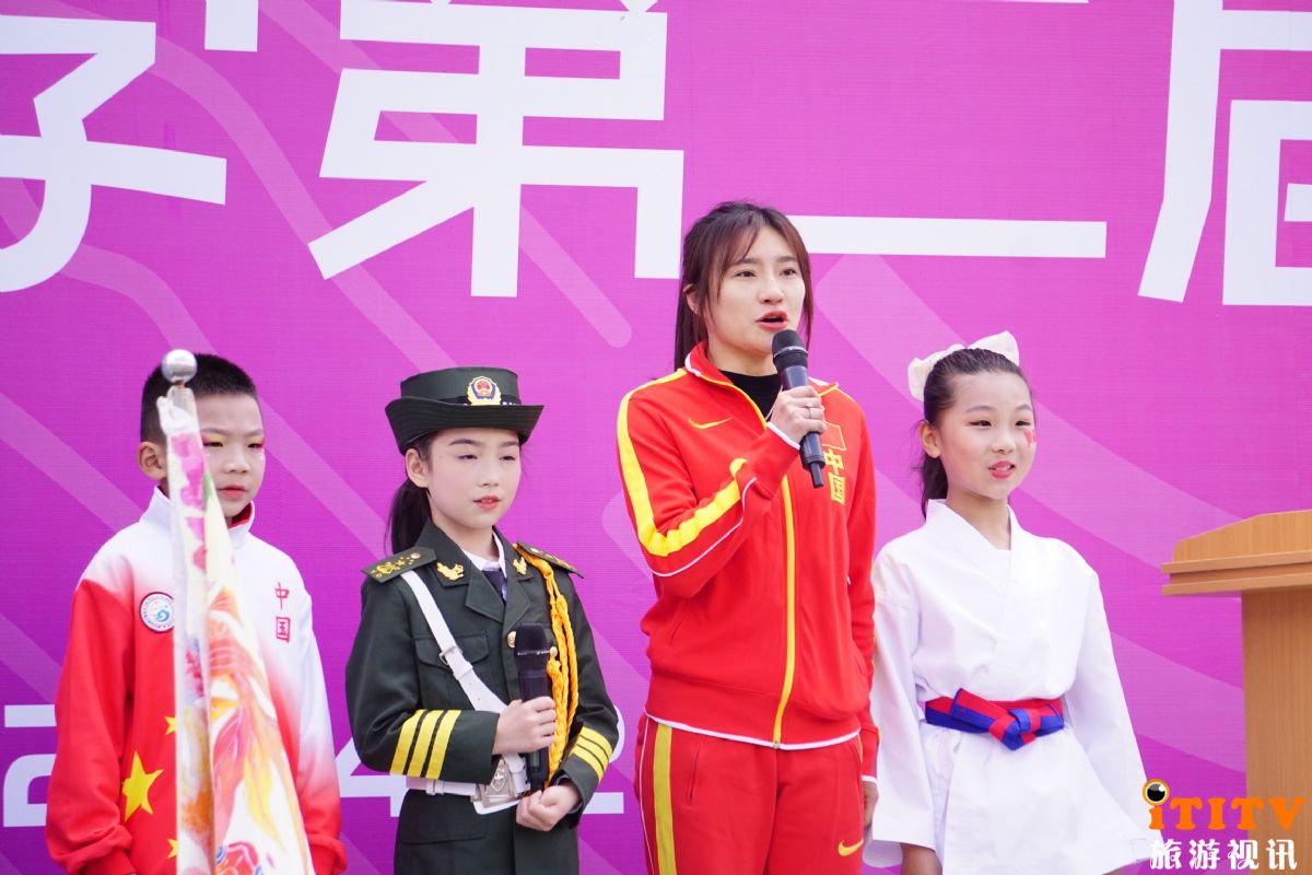 李渔小学特邀神秘嘉宾——国家运动健将叶佳贝,她曾获亚洲青年锦标赛100米冠军、亚运会4*100米亚军、并参加过世界青年锦标赛、世界田径锦标赛和奥运会,来到校运会开幕式现场后,赢得全场一片掌声。叶佳贝携学生代表洪钰麟、应思彤、朱彦诺一起登上主席台,共同宣布第二届李渔小学综合性运动会正式启动(图3)。