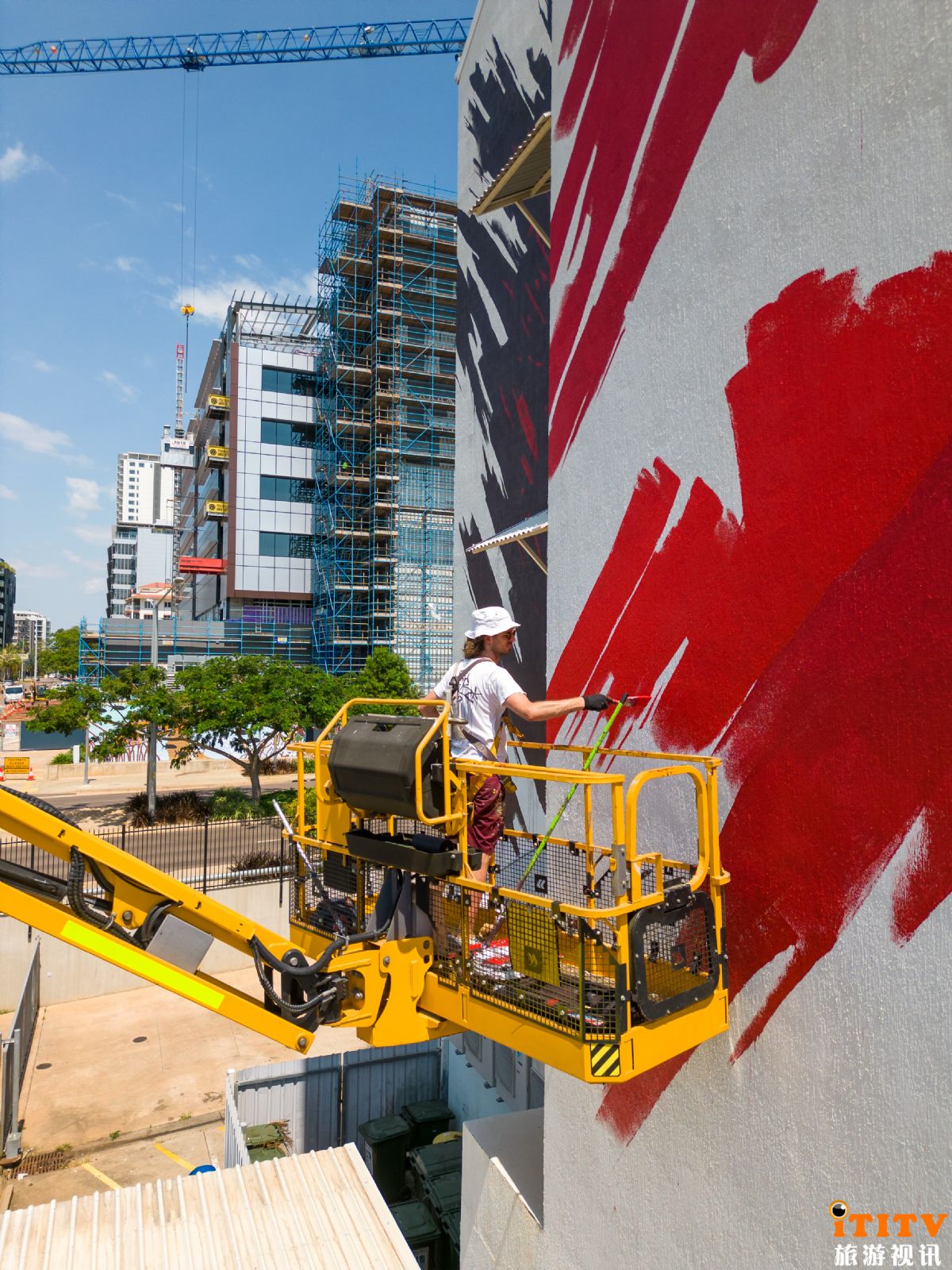 Adnate在不到6天的时间内完成了达尔文旅行之家(Travelodge) 度假村的壁画,这是一件非常不容易的事情,因为在他创作期间,平均每天最高温度为33.7°C,湿度在某些日子超过90%。