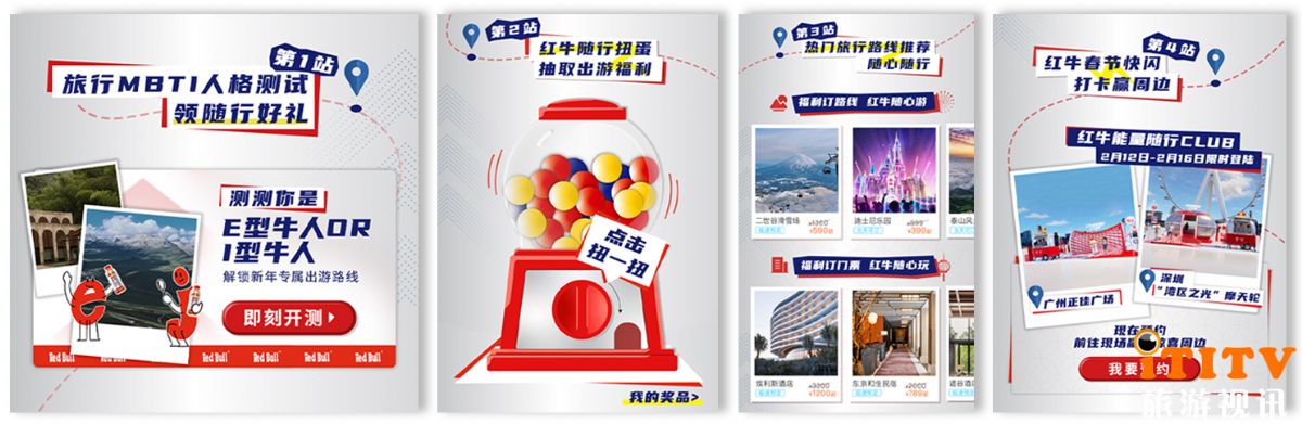 本次“红牛随行伴”活动聚焦 “好礼随心抽,福利随心订,春节随心游”三大主题方向,结合瓶装红牛®能量饮料产品特色,设置了多个场景的消费者互动环节。其中,天丝集团红牛品牌联合携程旅行网,打造机票、景区门票品牌专区,以及旅行线路定制H5互动。消费者可前往携程旅行APP,并于携程机票首页、“红牛随行伴”机票与景区门票活动页等页面中领取限量机票及景区门票优惠券;消费者还可于携程APP首页开启“红牛随行伴”旅行线路定制H5互动,并参与“MBTI人格测试”、“红牛随行扭蛋”等活动并领取随行好礼。此外,天丝集团将于广州正佳广场以及深圳“湾区之光”两大热门景区打造“红牛能量随行站”快闪店,并通过设置随行站沉浸馆、产品试饮、品牌打卡与抽奖等环节为消费者提供沉浸式出游场景体验,消费者可于“红牛随行伴”H5页面中进行快闪打卡预约。同时,天丝集团还将国内酒店进行合作,带来红牛主题房间住宿体验。