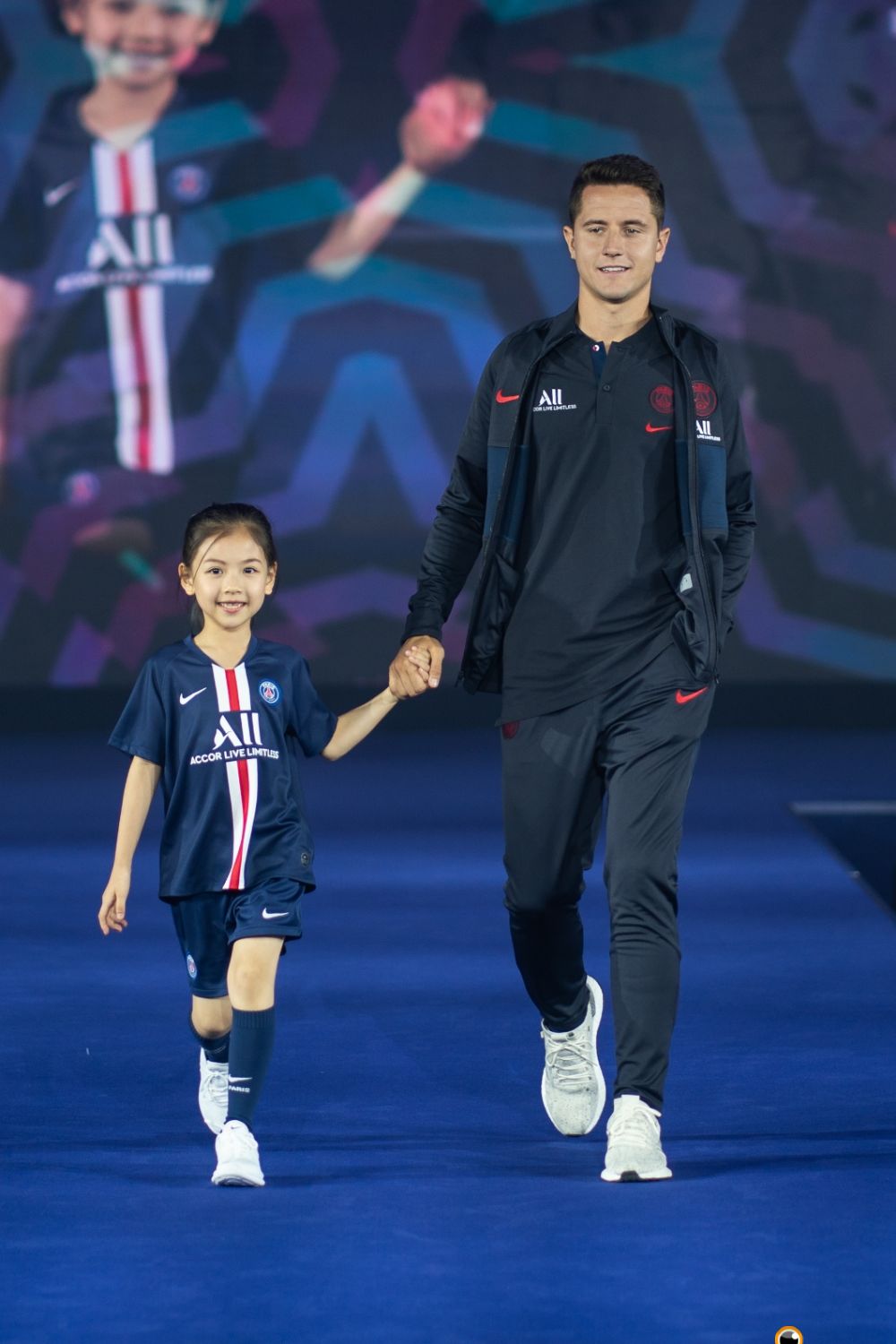 九位巴黎圣日耳曼明星球员身穿印有新赞助商ALL – ACCOR LIVE LIMITLESS雅高心悦界标志的2019-2020年主场球衣,手牵深圳的孩子们走上舞台。紧随在这些足球运动员之后,是模特和以维尼为领头的社交媒体时尚达人,他们身穿俱乐部与耐克、乔丹和品牌服装专属的合作款。