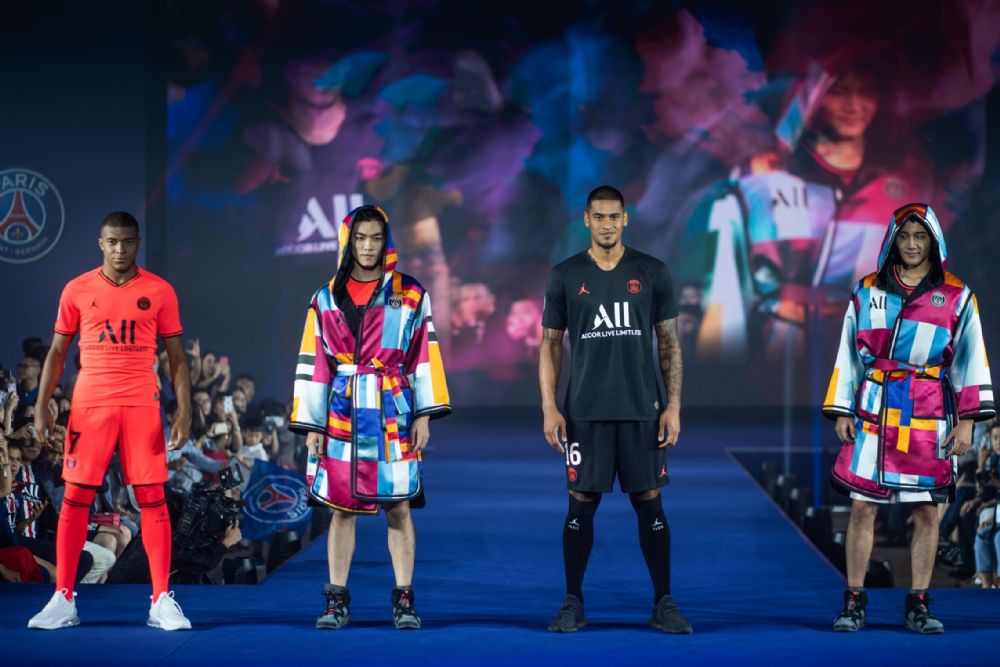 九位巴黎圣日耳曼明星球员身穿印有新赞助商ALL – ACCOR LIVE LIMITLESS雅高心悦界标志的2019-2020年主场球衣,手牵深圳的孩子们走上舞台。紧随在这些足球运动员之后,是模特和以维尼为领头的社交媒体时尚达人,他们身穿俱乐部与耐克、乔丹和品牌服装专属的合作款。