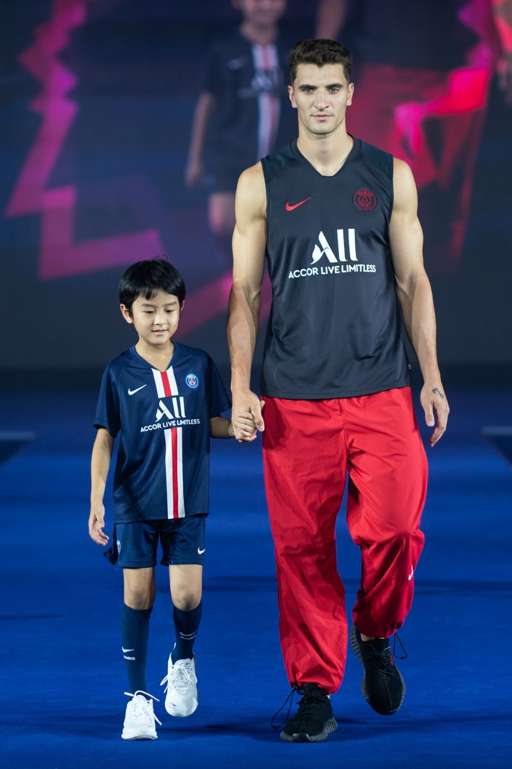 九位巴黎圣日耳曼明星球员身穿印有新赞助商ALL – ACCOR LIVE LIMITLESS雅高心悦界标志的2019-2020年主场球衣,手牵深圳的孩子们走上舞台。紧随在这些足球运动员之后,是模特和以维尼为领头的社交媒体时尚达人,他们身穿俱乐部与耐克、乔丹和品牌服装专属的合作款。