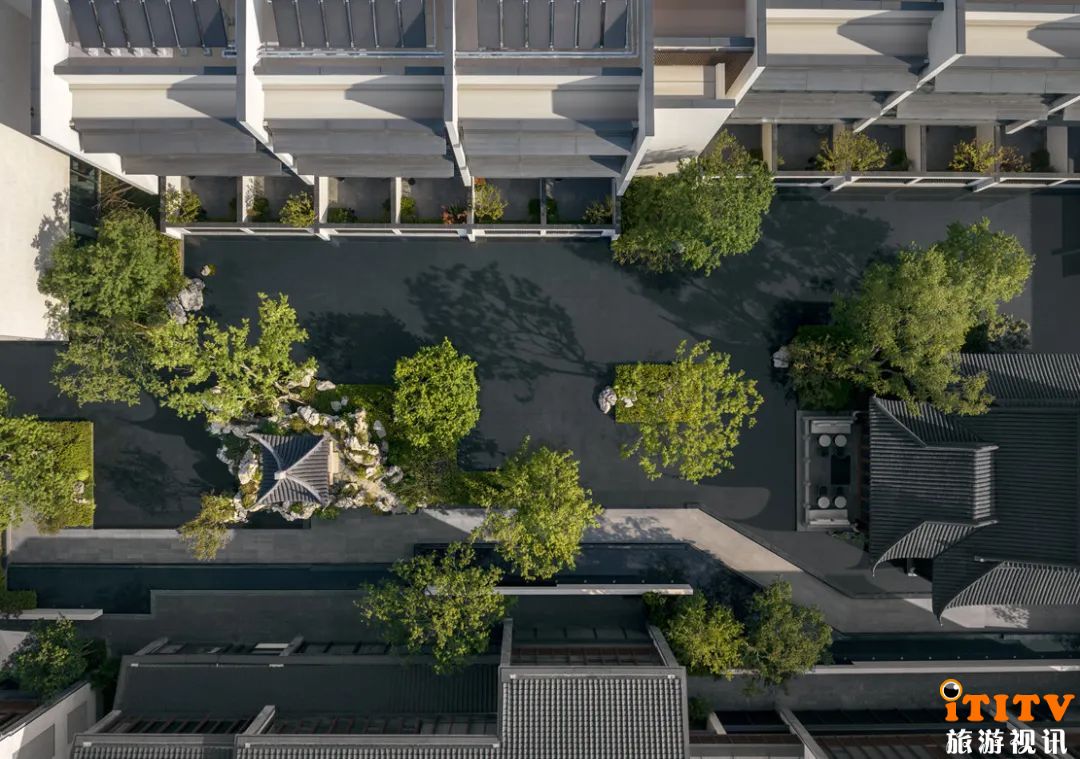 酒店在整个功能布局上充分考虑到将金普顿的品牌特色与当地文化进行充分融合。首先,从功能布局的角度来说,酒店的设计中融入了苏州园林的经典元素,粉墙黛瓦、亭台水榭、凌云古塔等。宾客漫步酒店时,会发现很多的特色苏派建筑元素以及老竹辉元素被融入酒店室内设计中,使得他们的旅程充满了美妙、亲切感以及奢华舒适的体验。酒店设计旨在为宾客带来惊喜和快乐,成为那些钟爱美食、美酒和欢聚一堂的宾客理想之地。在这里,宾客们既可以感受到摩登新潮的现代设计,也可以沉浸在精致古典的江南园林风情当中。穿过热闹的商业街区,踏进苏式园林酒店,潺潺的流水声让人仿佛进入静谧之所,周围的一切都变得安静起来,落客区则采用了传统中式建筑中“天圆地方”的设计理念,强调自然的阴阳平衡,动静互补。