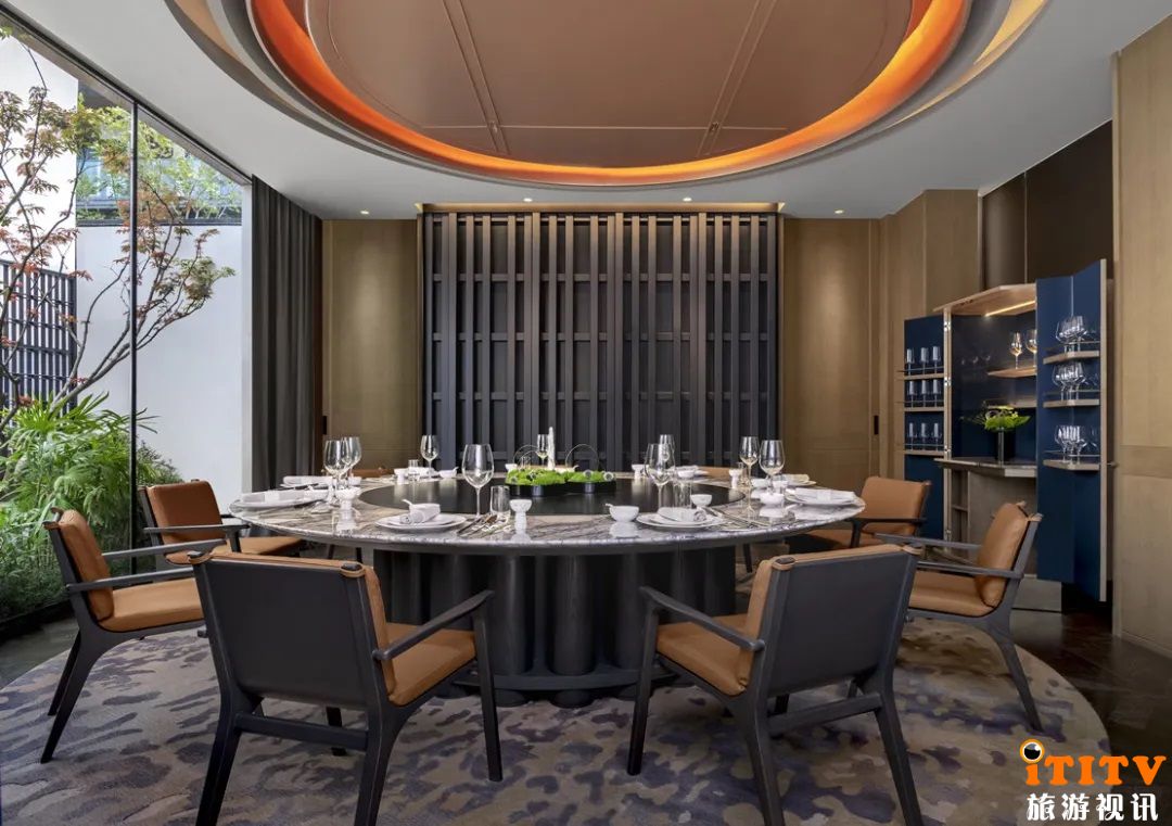 酒店在整个功能布局上充分考虑到将金普顿的品牌特色与当地文化进行充分融合。首先,从功能布局的角度来说,酒店的设计中融入了苏州园林的经典元素,粉墙黛瓦、亭台水榭、凌云古塔等。宾客漫步酒店时,会发现很多的特色苏派建筑元素以及老竹辉元素被融入酒店室内设计中,使得他们的旅程充满了美妙、亲切感以及奢华舒适的体验。酒店设计旨在为宾客带来惊喜和快乐,成为那些钟爱美食、美酒和欢聚一堂的宾客理想之地。在这里,宾客们既可以感受到摩登新潮的现代设计,也可以沉浸在精致古典的江南园林风情当中。穿过热闹的商业街区,踏进苏式园林酒店,潺潺的流水声让人仿佛进入静谧之所,周围的一切都变得安静起来,落客区则采用了传统中式建筑中“天圆地方”的设计理念,强调自然的阴阳平衡,动静互补。