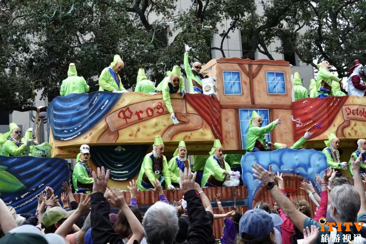 游行由专有俱乐部组织,我参加了奥菲斯克鲁(Krewe of Orpheus)的队伍,游行加跨夜晚会,共16个小时,嗨到次日凌晨3点!