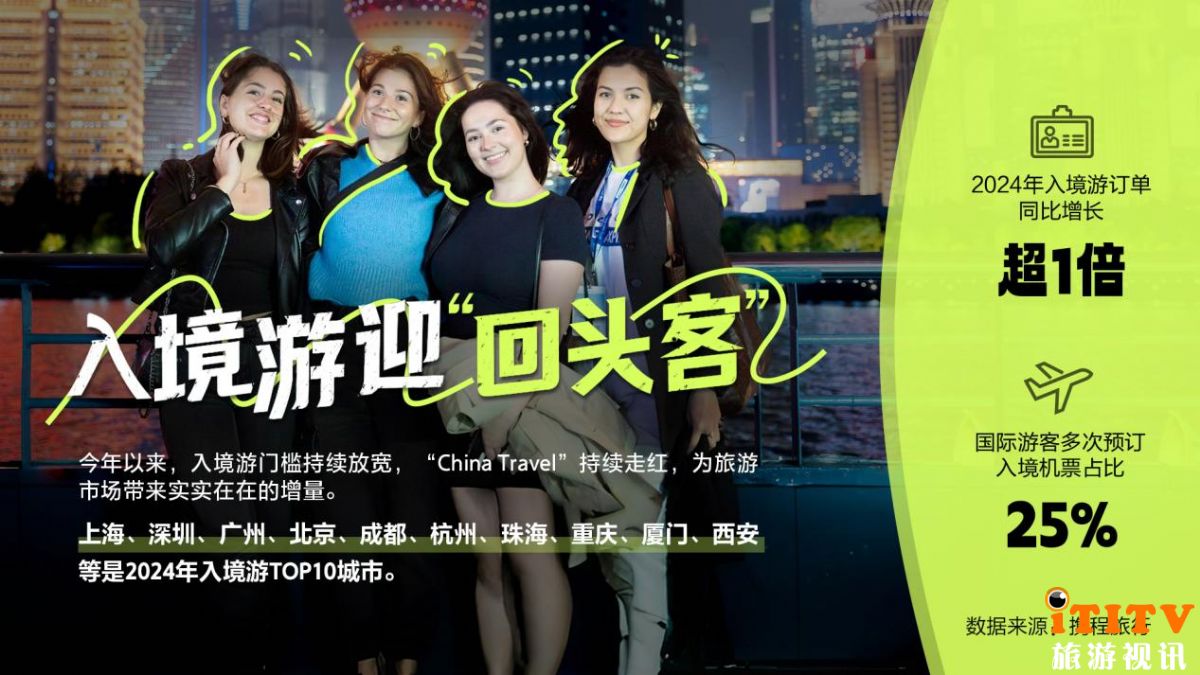 2024年,携程入境游订单同比增长超过1倍,享受过境免签政策的54国入境游订单量同比上涨189%。上海、深圳、广州、北京、成都、杭州、珠海、重庆、厦门、西安等成为入境游TOP10城市,韩国、泰国、新加坡、日本、马来西亚是入境的主要客源国。携程机票数据显示,2024年入境外国旅客中,每4个人中就有1个不止一次来过中国。凭借丰富的旅游资源和文化体验,中国正成为常来常新的超级目的地。