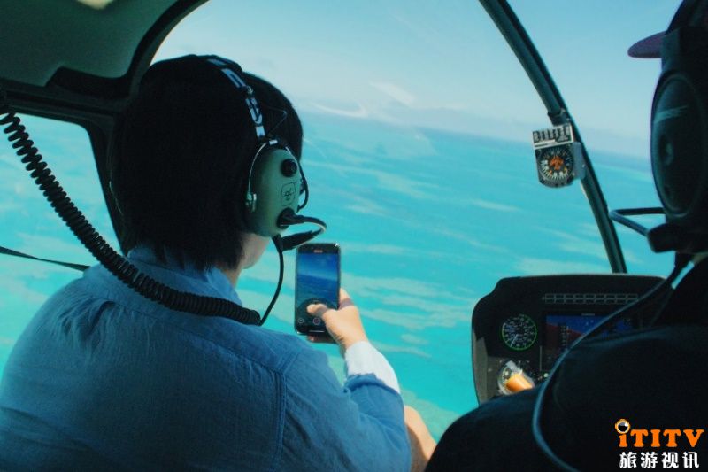 昆士兰之行的精彩远不止于海底探险。于适还乘坐直升机飞跃大堡礁,从空中俯瞰闻名遐迩的心形礁(Heart Reef)。这片珊瑚礁宛如镶嵌在碧海中的一颗心形宝石,浪漫至极。海水从浅蓝到深蓝交织,一簇簇的珊瑚礁如花一般盛开在神秘的海底,呈现出一幅如梦如幻的画面。于适被这片清澈的海水感动,忍不住拿着手机全程直拍。这场清澈入心的蓝色盛宴,成了澳大利亚之行记忆中最浪漫的一幕。