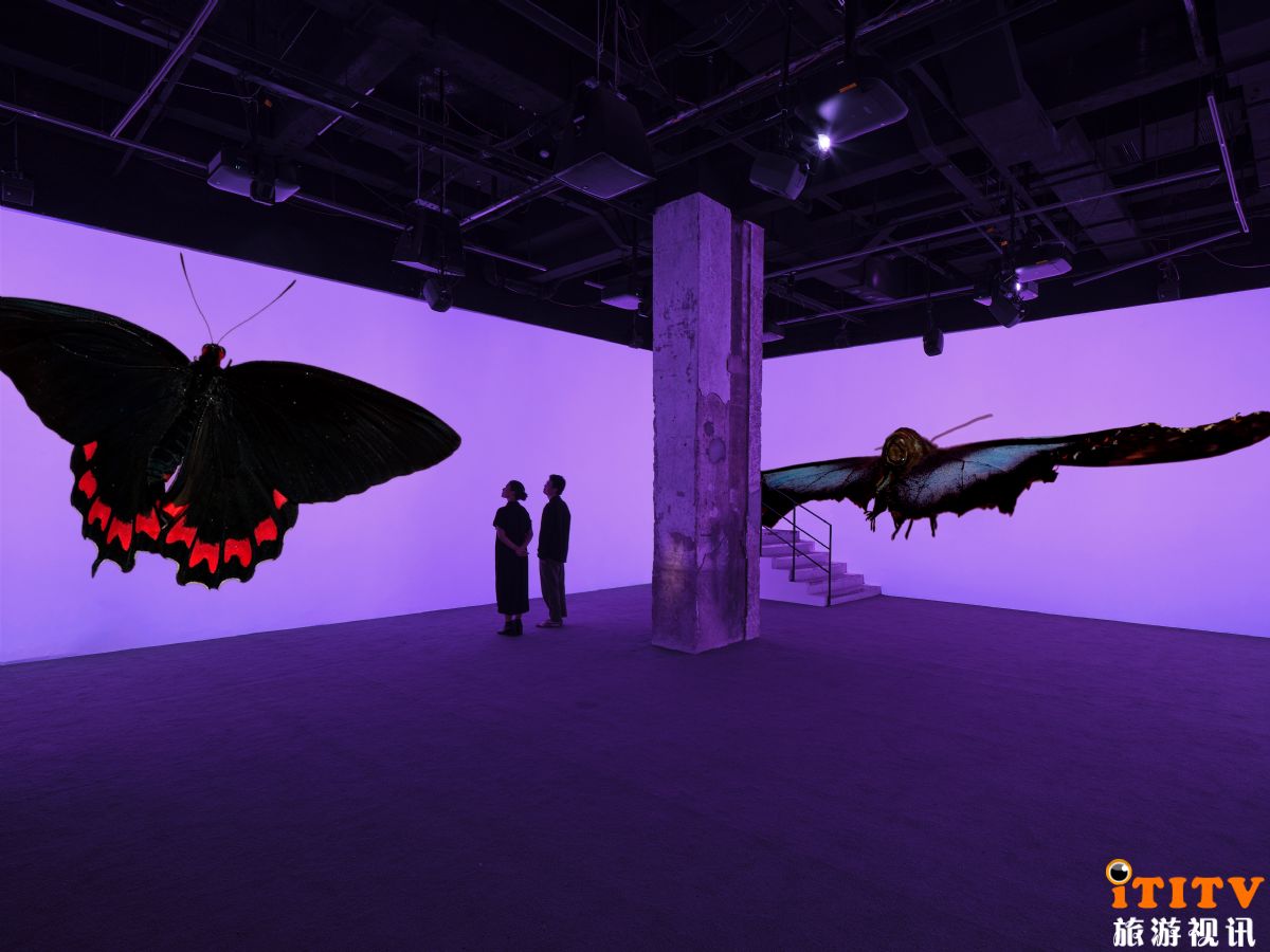 加尔瓦尼的艺术实践始终扎根于对自然与人类生存境况的探索,并游走于艺术与科学的边界。在此次最新影像创作中,艺术家运用每秒可捕捉百万帧的超慢动作摄影技术,将二十种濒危蝴蝶仅数周的短暂生命周期,精确延展至人类尺度的73年。通过这种对时间的精密拉伸,蝴蝶的生命被赋予人类的时间感知,它们振翅的瞬间被拉伸为恢弘的视觉史诗,鳞翅的颤动、破损的羽翼、脱落的与闪光鳞片,在发光的紫色宇宙中化为时间的具象符号。在投影构筑的另一个时间的平行宇宙中,观众得以亲历慢速流淌的影像中生命的脆弱与坚韧,体验一场跨越物种界限的沉浸式哲学对话——用分钟丈量一秒钟的坠落,凝视鳞片脱落的慢速轨迹,或聆听翅膀划破空气的无声频率,展览悄然模糊了生命与虚无、刹那与永恒的边界。