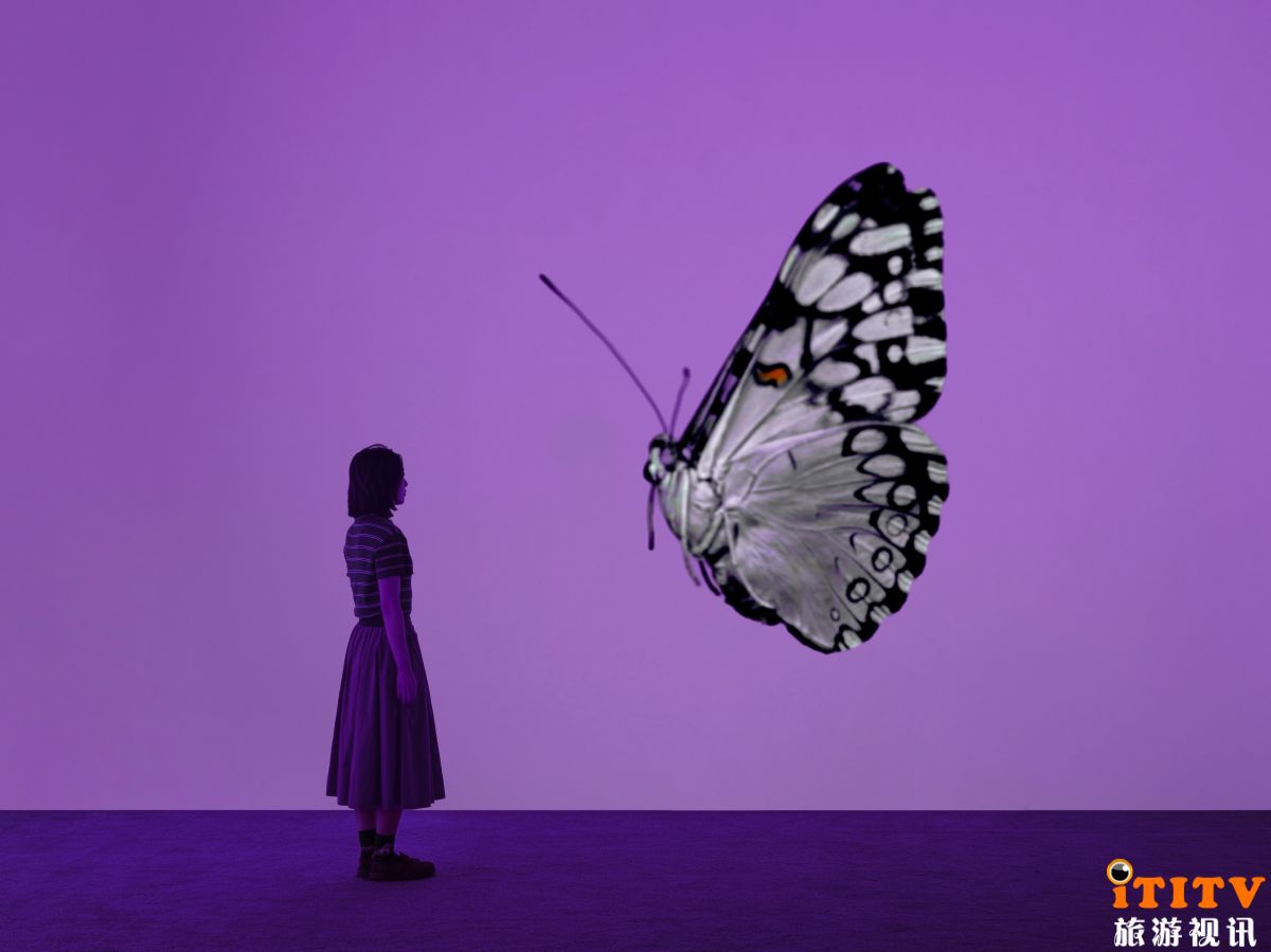 加尔瓦尼的艺术实践始终扎根于对自然与人类生存境况的探索,并游走于艺术与科学的边界。在此次最新影像创作中,艺术家运用每秒可捕捉百万帧的超慢动作摄影技术,将二十种濒危蝴蝶仅数周的短暂生命周期,精确延展至人类尺度的73年。通过这种对时间的精密拉伸,蝴蝶的生命被赋予人类的时间感知,它们振翅的瞬间被拉伸为恢弘的视觉史诗,鳞翅的颤动、破损的羽翼、脱落的与闪光鳞片,在发光的紫色宇宙中化为时间的具象符号。在投影构筑的另一个时间的平行宇宙中,观众得以亲历慢速流淌的影像中生命的脆弱与坚韧,体验一场跨越物种界限的沉浸式哲学对话——用分钟丈量一秒钟的坠落,凝视鳞片脱落的慢速轨迹,或聆听翅膀划破空气的无声频率,展览悄然模糊了生命与虚无、刹那与永恒的边界。