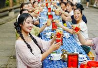 天街长桌晒秋宴,品味丰收滋味傍晚时分;天街丰收晒秋宴正式开席,成为当日活动的点睛之笔。诵读祝文、米酒开坛、敬酒歌演唱……满满的仪式感让游客快速融入丰收氛围。宴席菜品均以篁岭当季丰收作物为原料,南瓜、乌米饭、辣椒炒腊肉、椒盐桑叶等乡土菜肴,既还原了当地饮食特色,更让游客在味蕾享受中,切实体会 “丰收” 的丰富内涵。