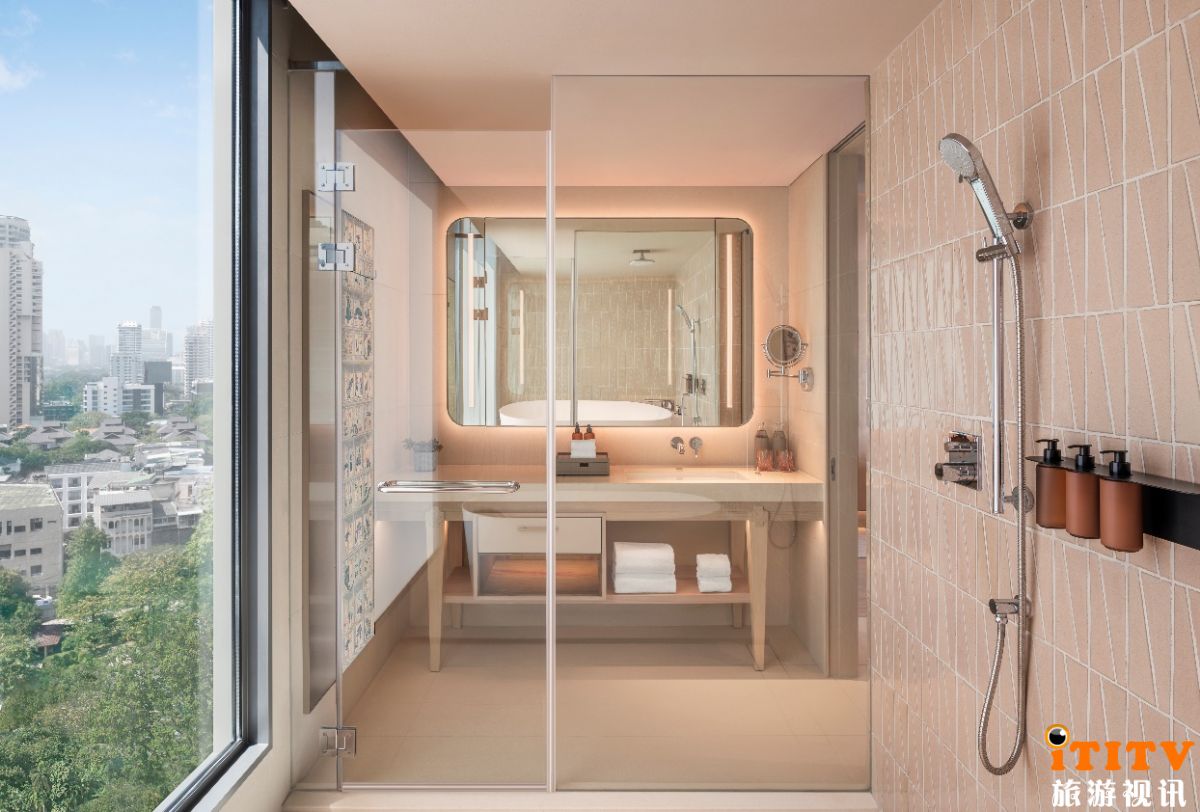 酒店拥有306间客房,涵盖大床房与双床房(起始面积30平方米),以及景致套房和科罗套房。客房以红宝石色调点缀,呼应曼谷标志性的粉色日落,营造出宁静祥和的氛围。红宝石意象化作太阳鸟的灵动身影,其虹彩羽毛纹理被巧妙织入客房与走廊地毯之中,将鸟儿的活力与优雅遍布空间每个角落。在这些私密天地里,泰国视觉艺术家Nakrob Moonmanas的精美插图呈现于浴袍、镜面板、套房壁画及抽屉内部,每一处细节都如同隐藏的惊喜,邀请宾客驻足探索。所有客房及走廊的室内设计均由LuxeLife Studio操刀,空间布局精心考量,精妙融合舒适体验与时尚格调。
