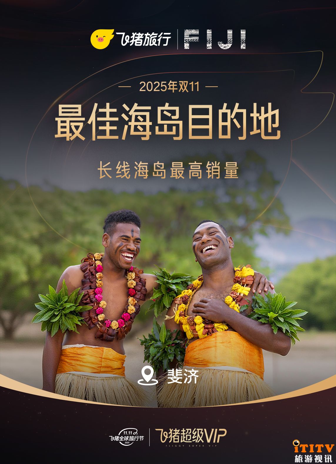 2025年12月11日,在阿里巴巴集团旗下综合性旅游服务平台飞猪发布的2025双十一旅行榜单中,斐济凭借出色的市场表现,荣获“最佳海岛目的地”称号,并位列全球长线海岛销量榜首位。这一成绩不仅反映了中国游客对斐济的高度青睐,也印证了斐济旅游局中国市场团队、斐济航空与飞猪平台在本地化精准营销方面的卓有成效的合作。双十一期间,斐济相关度假产品预订量同比提升22%,活动参与商品数增长43%,展现出中国游客对斐济旅游的持续热情与强劲需求。