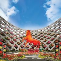 矗立于触阁中央的是高达8米的巨型骏马装置——“炎阳”,为周穆王骏马的守护者。装置周围环绕着精心布置的节庆花卉景观,营造出浓厚的新春氛围。这也是【圣淘沙心之音】历年来新春庆典中亮相的最高马主题装置。在象征勇气与恒久爱意的鸡冠花等节庆花艺点缀下,2.5米高的米奇与米妮雕塑陪伴左右。游客可通过互动装置,探索“炎阳”所寓意的八重祝福,感受马年的蓬勃能量。