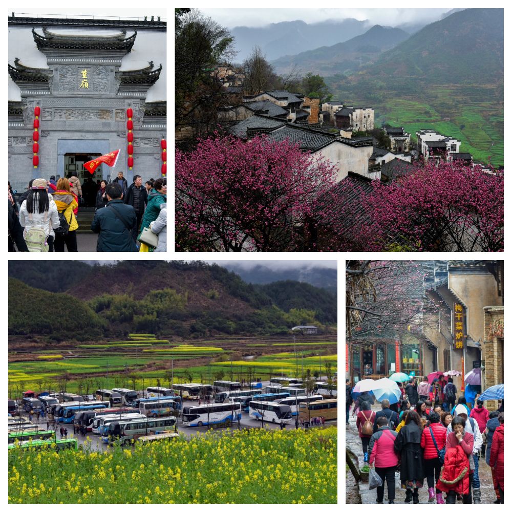 蒙蒙春雨之后,篁岭天街的梅花率先绽放,成片成片的将篁岭妆点上浪漫的玫瑰红色。紧跟着的油菜花也春心萌动:山下平原的油菜花田眼下已全部盛开,高岭梯田的油菜花预计在3月8日左右进入最佳观赏期。