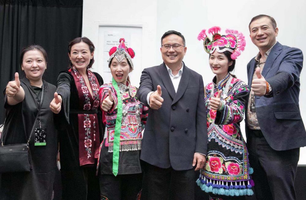 图2;东方国际集团的领导和来自楚雄的绣娘竖起了拇指,为本场大秀的成功点赞。(左起:东上海纺织时尚产业发展有限公司副总经理王露、姚沁,东方国际集团董事长童继生、上海纺织时尚产业发展有限公司总经理朱伟明和彝绣绣娘代表。)