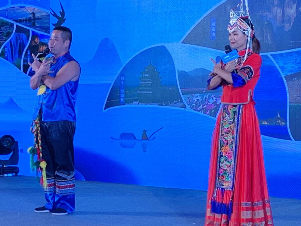 朱小杰又带大家走进刘伯温故里文成,开启第三篇章《触摸大自然》。他讲到,世人都知道刘伯温辅佐朱元璋打江山、神机妙算的故事,但他最成功的是教育后代,刘伯温现在的子孙多达6万人,分布在世界各地,但每年回文成祭祖的子孙达500桌,这在世界也是少有的。推荐大家去刘伯温故里三大核心景区走一走,感受百丈漈的壮美、安福寺的宁静、刘基庙的韵味,听听刘伯温神机妙算的那些故事,都能收获到刘伯温的智慧。随后,朱小杰开始讲述平阳浙一大红色研学之旅带给孩子们的教育意义,介绍最受孩子们欢迎的亲子牧场——云岚牧场,回忆自己曾经走过泰顺廊桥、苍南碗窑、瑞安曹村、乐清黄檀硐、瓯海梅雨潭、龙湾永昌堡的时光。《迎客歌》的悠扬旋律回荡在整个会场,歌者用嘹亮的嗓音热情欢迎上海市民来温州做客。