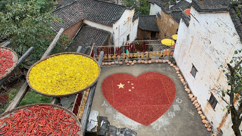图3:村民巧用红辣椒拼成了“五星红旗”游客拍照留念