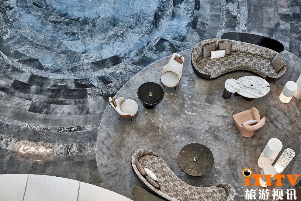 作为旅程的起点,设计师将中庭大厅打造为船只靠岸、停泊、交流、汇集的温馨港湾。大堂中每一处的空间犹如河流上随机投下石子后布下的涟漪般,自然地定位于弧形大堂空间中。60米的挑高中庭形成一个造型独特的A字,远望过去,犹如一艘停泊在黄浦江岸的客船。各个柜台皆以几何雕塑造型呈现,每一道外型俐落、简洁的家具也都比拟河流上穿梭的大小船只,栖游其中。贯穿中庭的落地窗自然地将光影引入室内,将远处滨江景致映入眼帘。跟随着中庭十字主轴的动线,宾客可通过左边茶廊或右边的电梯厅,继续探索他们的旅程。