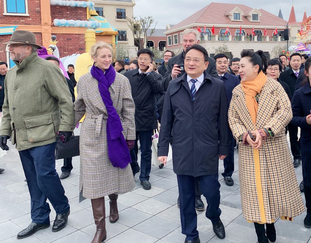 图4:11月28日,射阳安徒生童话乐园开园首日,中央电视台少儿节目主持人“月亮姐姐”王昊,丹麦王室亚历桑德拉公主、阿勒弗里德特伯爵和安徒生奖创始人本尼·尼伯等专程前往出席
