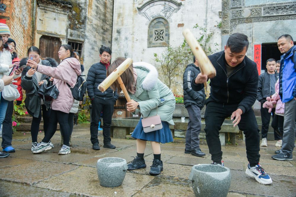 打麻糍是冬至庆丰收的重要环节,在篁岭众屋广场上,6个石臼一字排开,热气腾腾的糯米倒入其中,有经验的村民们撸起袖子,一边打一边翻,配合非常默契。游客们跃跃欲试,也来体验一番,还能吃到自己亲手参与制作的麻糍,现场氛围十分火热。