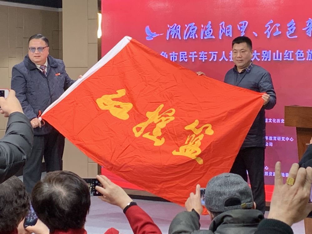 上海市中共党史学会副会长刘敏向“2020迎新春上海市民千车万人挺进大别山 红色旅游再出发”活动授旗并宣布红色旅游圣火采集传递启动。